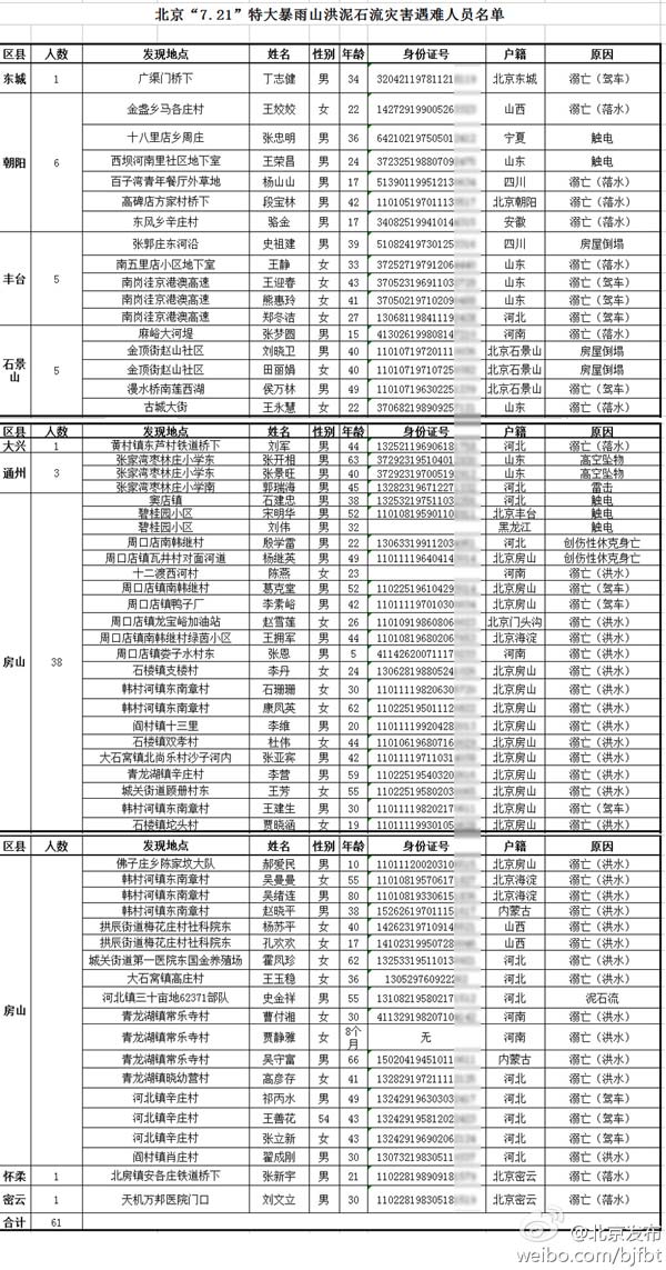 北京市防汛抗旱指揮部新聞發言人介紹,已確認身份的66名遇難者中包括在搶險救援中因公殉職的5人。剩餘61名遇難者中,男性36人,女性25人。其死亡原因為:溺水46人,觸電5人,房屋倒塌3人,泥石流2人,創傷性休克2人,高空墜物2人,雷擊1人。