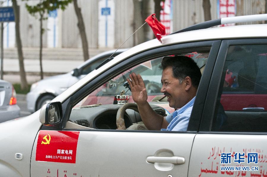 在新疆和田,有一輛車身貼滿紅色黨旗和黨徽的銀灰色小卧車,“十公里內免費接送”的維吾爾文、漢文標語貼在後車窗上。在近5年的時間裏,這輛維吾爾族大叔艾尼瓦爾·芒素私家的小汽車,搭上了汽油(天然氣)費、過路費等成本費數萬元,免費接送老弱病殘乘客上萬人次,被網民親切地稱為“私車公用大叔”。新華社記者沈橋攝