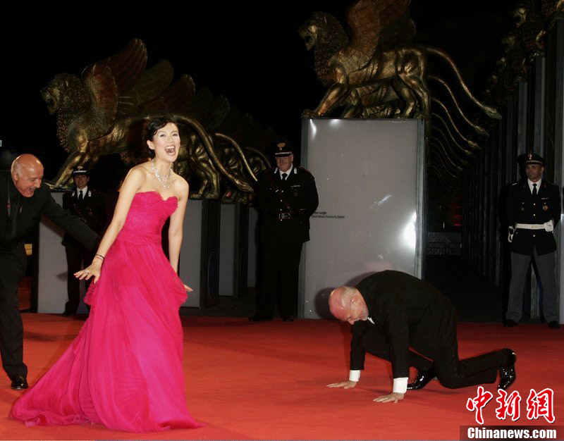 華人女星在威尼斯的亮相中最拉風的當屬章子怡,2006年第63屆威尼斯電影節小章一襲阿瑪尼正紅色長裙散發出陣陣“皇后娘娘”氣場,引得電影節主席馬可·穆勒拜倒,雖純屬搞笑,但這一幕堪稱華人明星在威尼斯紅地毯上的經典時刻。圖片來源:CFP視覺中國