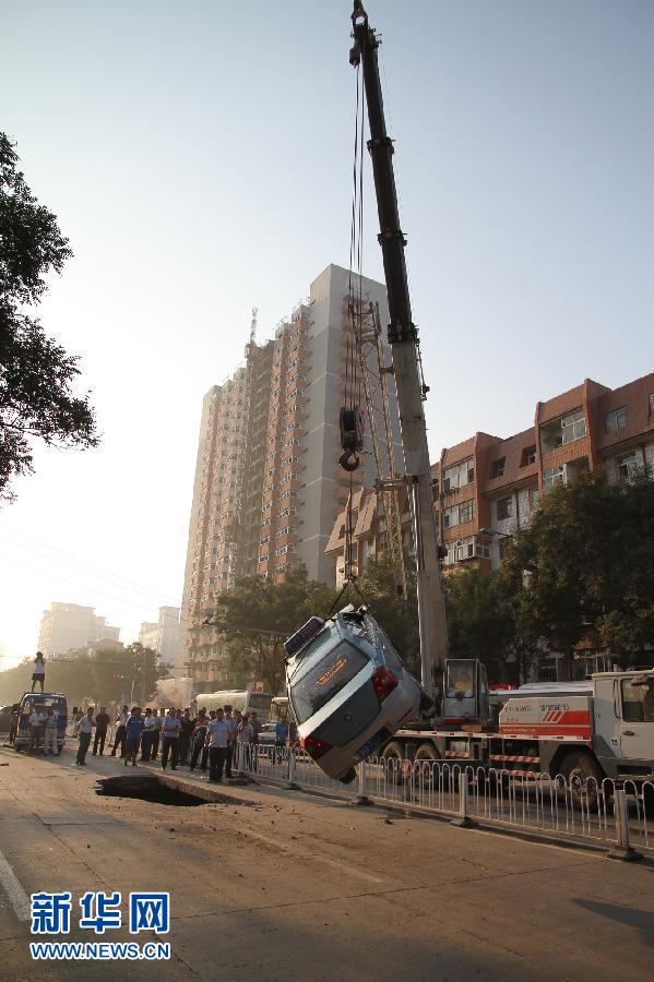 8月29日,在河北邯鄲市聯紡路事故現場,救援人員利用吊車將出租車吊出大坑。當日5時許,河北省邯鄲市一輛出租車在聯紡路由東向西行駛中,路面突然發生塌陷,出現一個長約7米、寬約5米、深約3米的大坑,出租車墜入坑中。事故發生後,當地交警、市政人員立即趕往現場救援,出租車司機及搭載的一名乘客被送往醫院。路面塌陷原因尚在調查中。新華社發