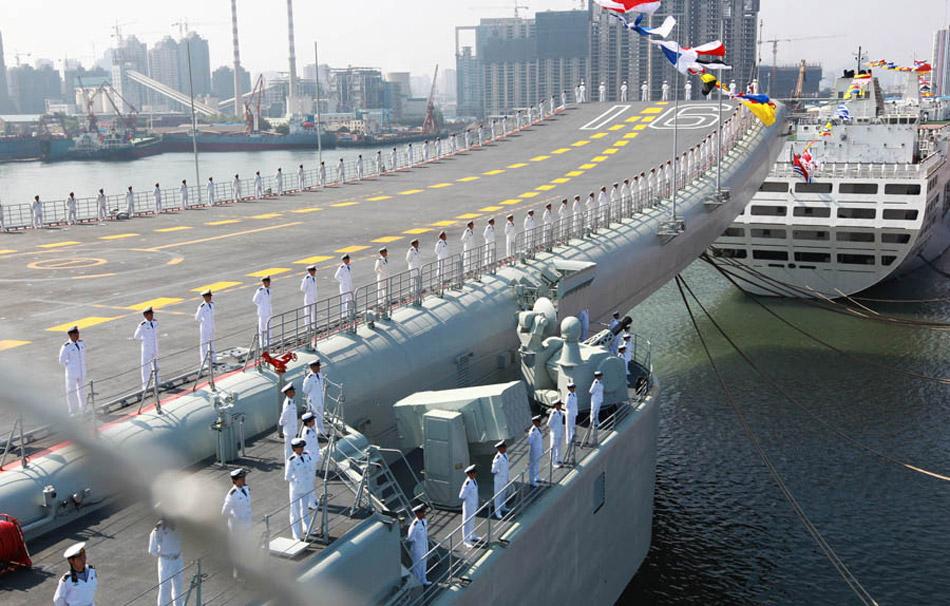 9月25日,我國第一艘航空母艦“遼寧艦”已按計劃完成建造和試驗試航工作。這是中國海軍航母平台港內停泊照片。 新華社發(李唐攝)