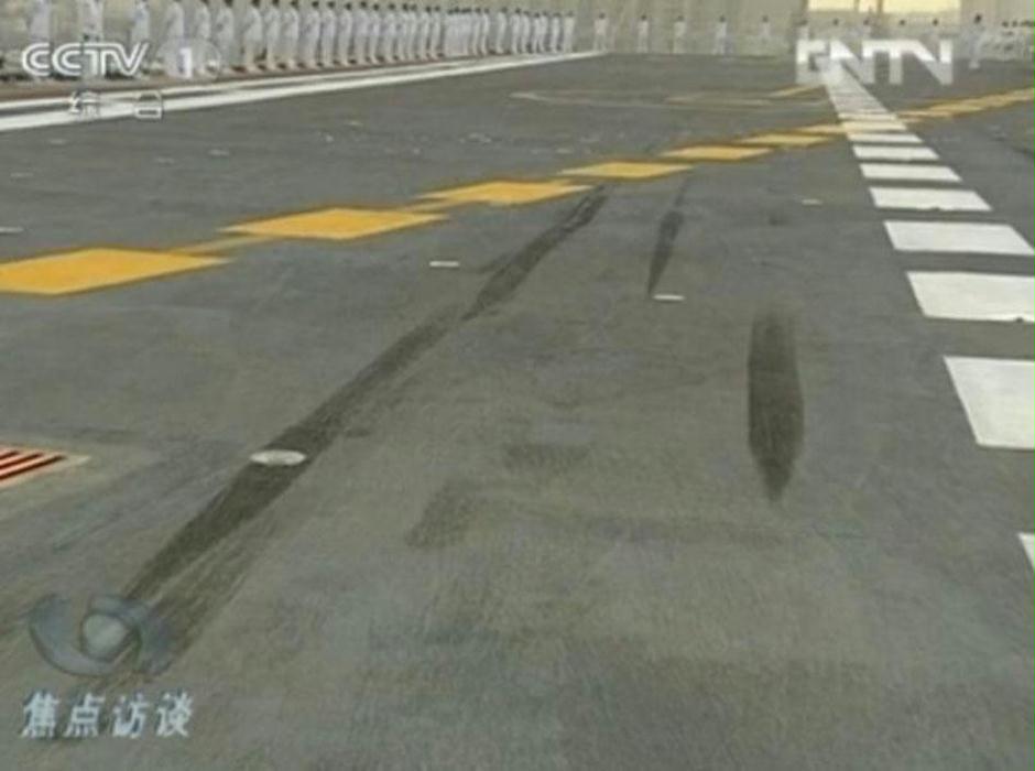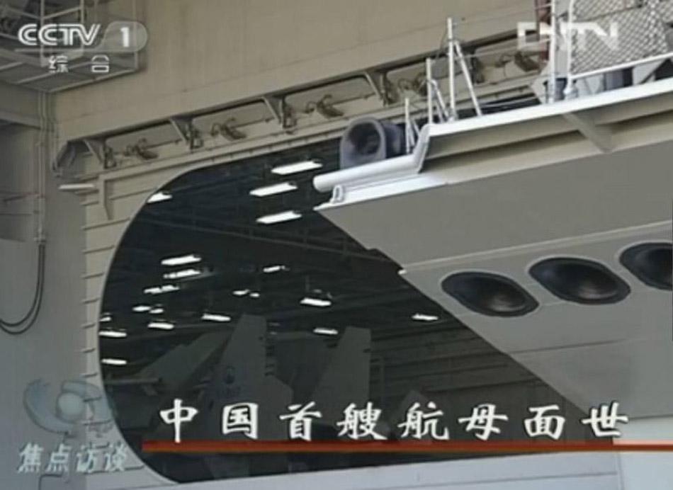 9月25日,我國第一艘航空母艦“遼寧艦”在中國船舶重工集團公司大連造船廠正式交付海軍。圖為中國首艘航母機庫內停放的疑似艦載機。(央視截圖)