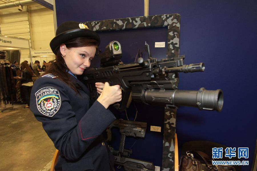 9月26日,在烏克蘭首都基輔,一名女子在2012年國際武器展覽會上試槍。當日,位於基輔的烏克蘭國際展覽中心舉辦為期4天的國際武器展覽會。展品來自烏克蘭、俄羅斯、荷蘭、捷克和利比亞等國,包括作戰武器、狩獵用彈藥、軍事光學眼鏡及配件、軍事制服、反恐裝備和軍事通信裝備等。新華社發(斯塔羅斯堅科攝)