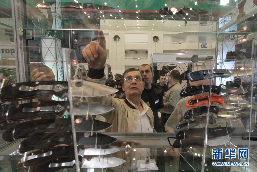 9月26日,在烏克蘭首都基輔,一名武器愛好者在2012年國際武器展覽會上觀看刀具。當日,位於基輔的烏克蘭國際展覽中心舉辦為期4天的國際武器展覽會。展品來自烏克蘭、俄羅斯、荷蘭、捷克和利比亞等國,包括作戰武器、狩獵用彈藥、軍事光學眼鏡及配件、軍事制服、反恐裝備和軍事通信裝備等。新華社發(斯塔羅斯堅科攝)