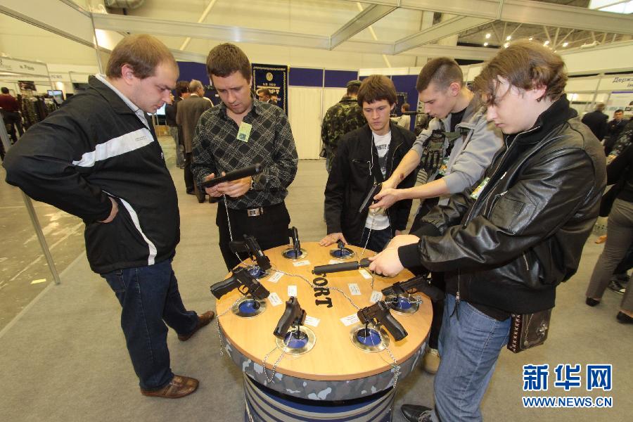 9月26日,在烏克蘭首都基輔,武器愛好者們在2012年國際武器展覽會上試槍。當日,位於基輔的烏克蘭國際展覽中心舉辦為期4天的國際武器展覽會。展品來自烏克蘭、俄羅斯、荷蘭、捷克和利比亞等國,包括作戰武器、狩獵用彈藥、軍事光學眼鏡及配件、軍事制服、反恐裝備和軍事通信裝備等。新華社發(斯塔羅斯堅科攝)