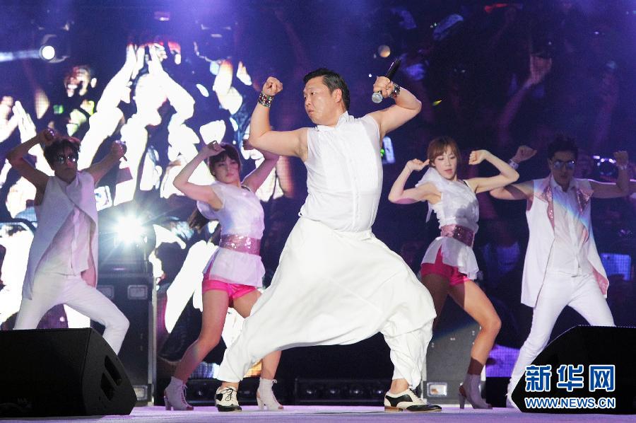 韓國流行歌壇老將樸載相(也稱Psy)近期憑藉一曲《江南Style》風靡多國樂壇。這首歌的音樂錄影在一家知名視頻網站上的點擊率已超過2.7億人次。業界分析人士認為,這首歌之所以在韓國流行、在歐美受到熱捧,是因為歌曲風格幽默而諷刺、樸載相未經後天“加工”的形象以及他那別具特色的馬步舞姿。 2012年8月11日,韓國歌手樸載相(右)在首爾舉辦的演唱會上表演。 新華社/路透(戴天放編輯)