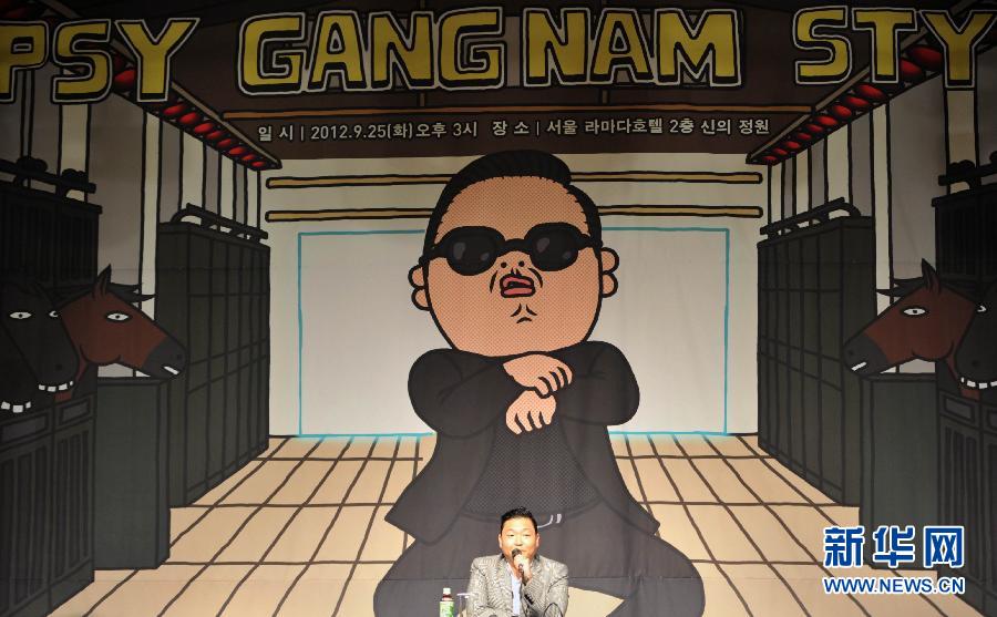 韓國流行歌壇老將樸載相(也稱Psy)近期憑藉一曲《江南Style》風靡多國樂壇。這首歌的音樂錄影在一家知名視頻網站上的點擊率已超過2.7億人次。業界分析人士認為,這首歌之所以在韓國流行、在歐美受到熱捧,是因為歌曲風格幽默而諷刺、樸載相未經後天“加工”的形象以及他那別具特色的馬步舞姿。 2012年9月25日,韓國歌手樸載相在結束美國之行後在首爾舉行新聞發佈會。 新華社發(朴真熙攝)(戴天放編輯)