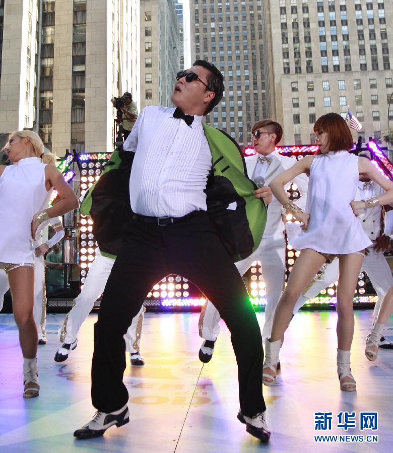 韓國流行歌壇老將樸載相(也稱Psy)近期憑藉一曲《江南Style》風靡多國樂壇。這首歌的音樂錄影在一家知名視頻網站上的點擊率已超過2.7億人次。業界分析人士認為,這首歌之所以在韓國流行、在歐美受到熱捧,是因為歌曲風格幽默而諷刺、樸載相未經後天“加工”的形象以及他那別具特色的馬步舞姿。 2012年9月14日,韓國歌手樸載相在美國紐約NBC(全國廣播公司)的“今天”秀上表演。 新華社/美聯(戴天放編輯)
