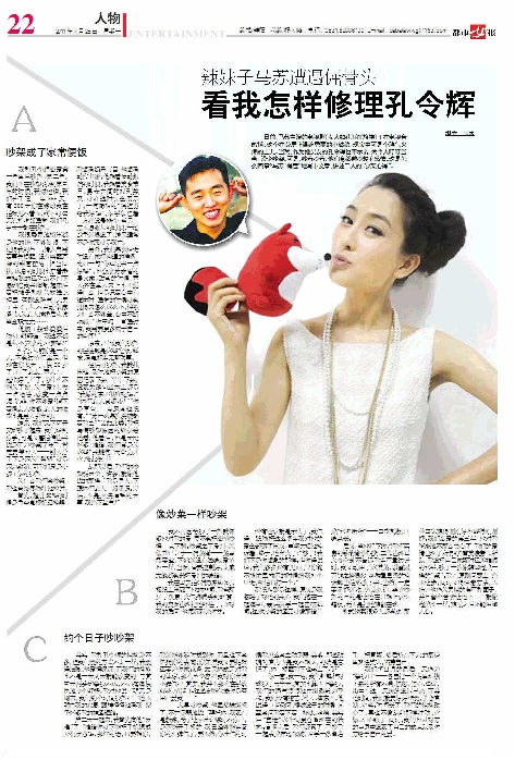 2002年釜山亞運會後,朋友邀請孔令輝去參加一個聚會。鄰座有個眼睛大大的女孩引起了他的注意,這不就是電視裏經常播放的一個廣告的女主角嗎。女孩輕輕側轉身子,剛好和孔令輝打了個照面。女孩的眼睛睜得更大了,她衝孔令輝點了點頭,微微一笑,那一刻,她真是明眸皓齒。孔令輝反倒有點不好意思了,只好咧着嘴傻笑起來。