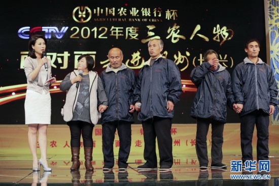 11月17日,由中國農業電影電視中心、湖州市委市政府主辦的CCTV2012年度三農人物面對面活動在浙江湖州舉行。愛心公益人士——田洪武、一諾千金的八零後女孩——趙燦、在外鄉高舉黨旗的黨員——灌南縣駐杭州市流動黨員黨委書記邵中國、開創扶貧治沙新模式的沙漠之子——內蒙古東大蒙古王集團董事長趙永亮等四位候選人分別走上舞台,和在場的300多名羣眾一起分享了自己的成長故事、創業經歷以及成功經驗,並回答現場提問。據瞭解,本屆三農人物推介活動已經是第八次舉辦。此前七屆,活動已陸續推出了袁隆平、趙本山、陳光標、吳仁寶、叢飛、李登海、馬復興等一批典型人物,彰顯了人物的高貴品格和時代精神,在推動三農事業發展中發揮了很好的輿論導向作用。11月17日,河北省滄州市鹽山縣陳莊村盲人四兄弟及義女趙燦(左二)一起分享自己的經歷。(新華網 發)