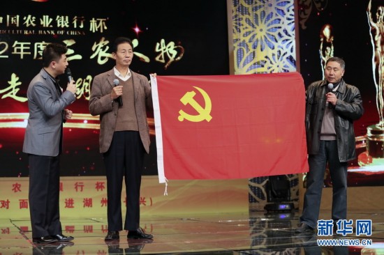 11月17日,由中國農業電影電視中心、湖州市委市政府主辦的CCTV2012年度三農人物面對面活動在浙江湖州舉行。愛心公益人士——田洪武、一諾千金的八零後女孩——趙燦、在外鄉高舉黨旗的黨員——灌南縣駐杭州市流動黨員黨委書記邵中國、開創扶貧治沙新模式的沙漠之子——內蒙古東大蒙古王集團董事長趙永亮等四位候選人分別走上舞台,和在場的300多名羣眾一起分享了自己的成長故事、創業經歷以及成功經驗,並回答現場提問。據瞭解,本屆三農人物推介活動已經是第八次舉辦。此前七屆,活動已陸續推出了袁隆平、趙本山、陳光標、吳仁寶、叢飛、李登海、馬復興等一批典型人物,彰顯了人物的高貴品格和時代精神,在推動三農事業發展中發揮了很好的輿論導向作用。11月17日,灌南縣駐杭州市流動黨員黨委書記邵中國(左二)與工友周達銀共同展示黨旗。(新華網 發)