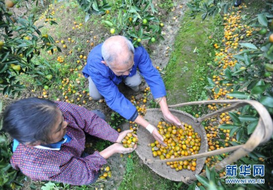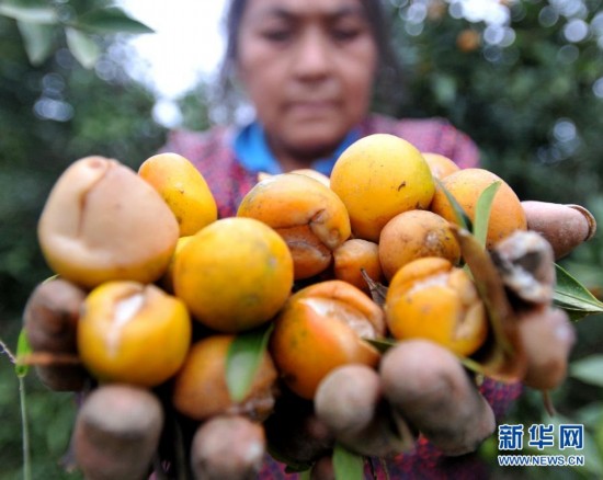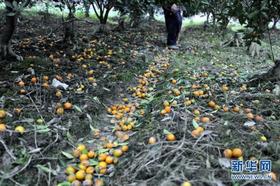 11月19日,廣西桂林市靈川縣潭下鎮,果農撿拾腐爛掉在地上的金桔。連日來,廣西桂林市靈川縣潭下鎮遭遇冬雨襲擊,全鎮4000多畝即將進入收穫季節的金桔爛在樹上,給果農帶來上百萬元的經濟損失。目前,當地有關部門和果農正採取加蓋保護膜等措施保護果樹,儘量減少損失。新華社記者 陸波岸攝