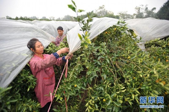 11月19日,廣西桂林市靈川縣潭下鎮,果農在給果樹加蓋保護膜。連日來,廣西桂林市靈川縣潭下鎮遭遇冬雨襲擊,全鎮4000多畝即將進入收穫季節的金桔爛在樹上,給果農帶來上百萬元的經濟損失。目前,當地有關部門和果農正採取加蓋保護膜等措施保護果樹,儘量減少損失。新華社記者 陸波岸攝