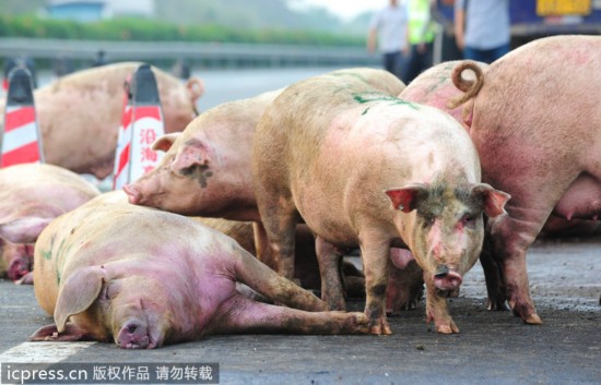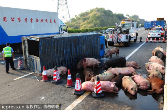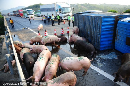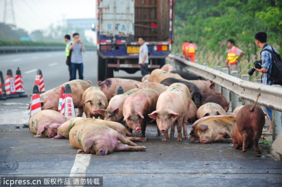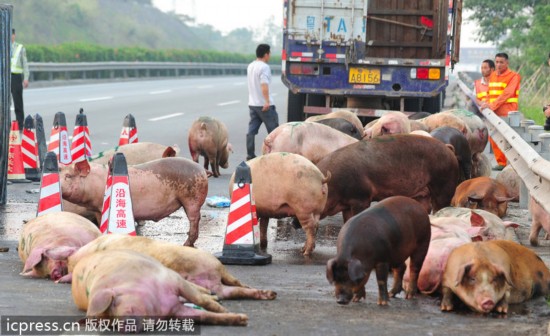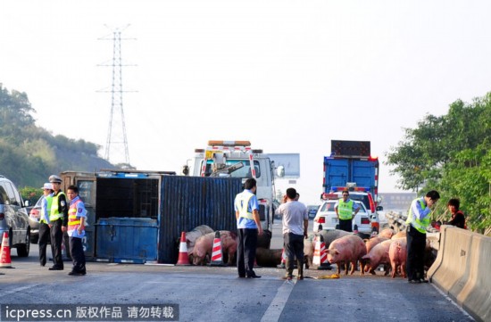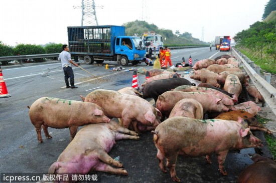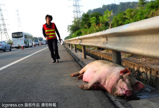 運豬車廣澳高速爆胎側翻 30多頭生豬高速路上撒歡