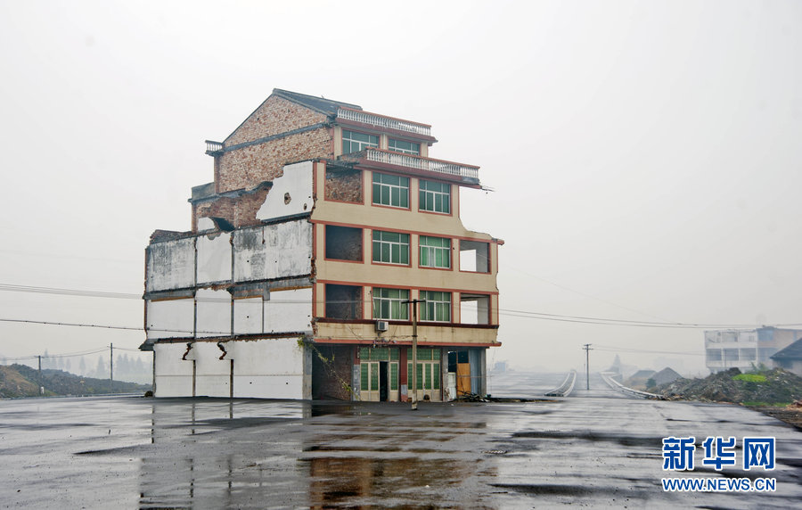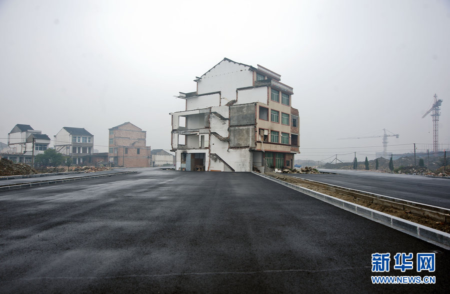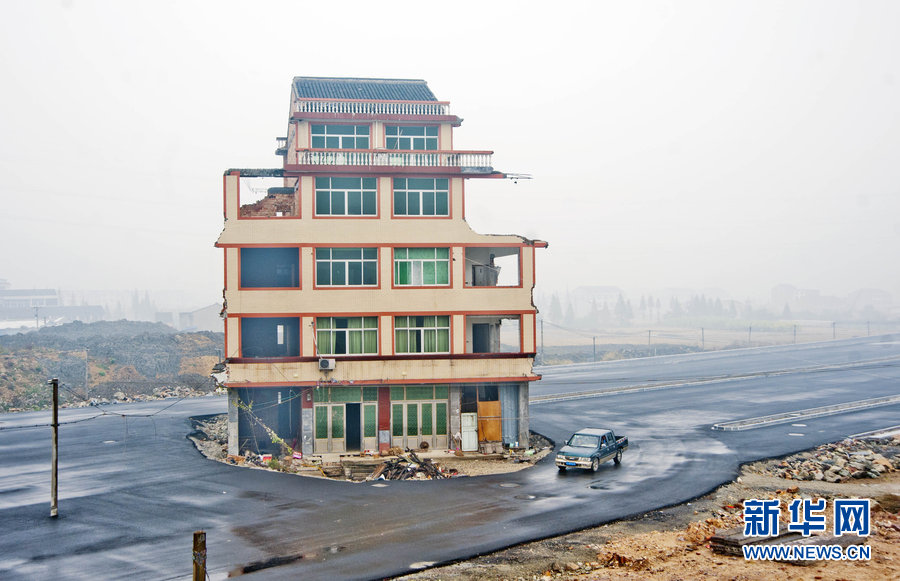 2012年11月21日下午,位於浙江温嶺火車站前未開通的大道上,四間樓房巍然矗立在路中間,其中兩間還住着居民。儘管路還沒有正式開通,但是有一些車輛經過,都得繞着房子通行。