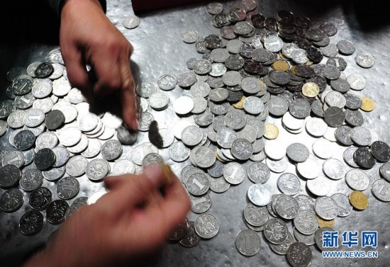11月18日,江蘇省太倉市公交公司結算中心的點鈔員將錢箱中的硬幣、紙幣倒出。