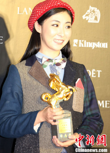 11月24日晚,第四十九屆金馬獎在台灣宜蘭揭曉,自稱“職業宅女”、著有長篇小説《失戀33天》的北京女作家鮑鯨鯨,以《失戀33天》獲得最佳改編劇本獎。中新社發 董會峯 攝