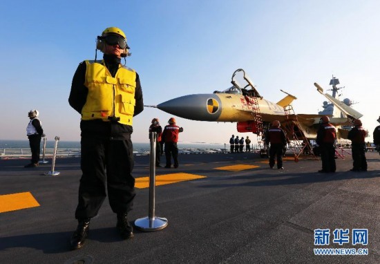 這是“遼寧艦”艦麪人員在為殲—15艦載機進行保障工作。 9月25日我國第一艘航空母艦“遼寧艦”交接入列後,海軍官兵以科學求實的態度和頑強拼搏的精神,按計劃迅速投入緊張的出海訓練和科研試驗任務中。期間,順利進行了殲—15飛機起降飛行訓練。航母平台和飛機的技術性能得到了充分驗證,艦機適配性能良好,達到了設計指標要求。殲—15飛機是我國自行設計研製的首型艦載多用途戰鬥機,具有完全的自主知識產權,可遂行制空、制海等作戰任務,飛行性能良好,配掛多型精確制導武器,具備遠程打擊和晝夜間作戰能力。新華社記者 查春明 攝
