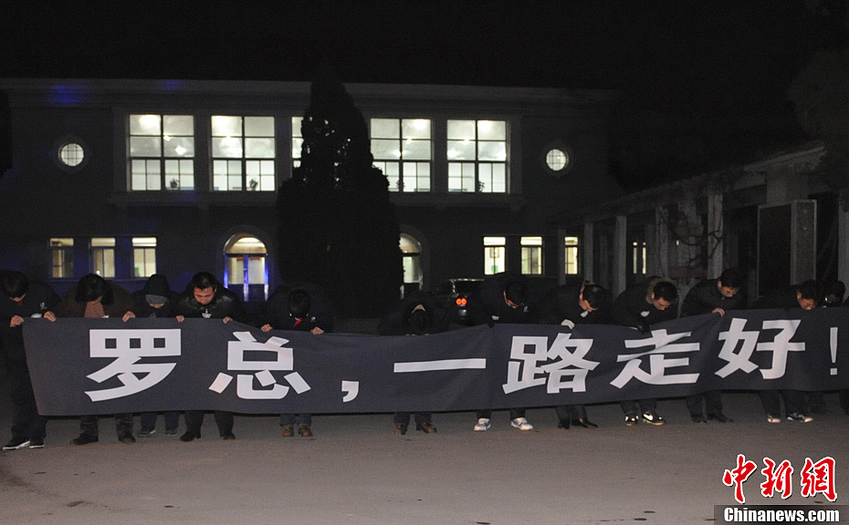 25日晚上,沈飛公司和瀋陽飛機設計研究所的院內站滿了近萬名送行的職工,很多職工特意開車從家裏趕來,寒風中人羣打出“羅總一路好走”的橫幅。