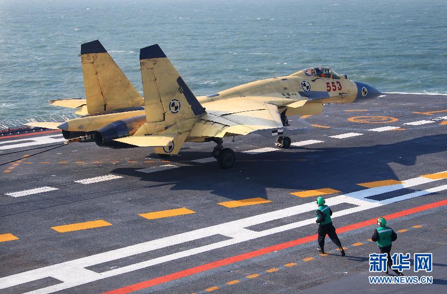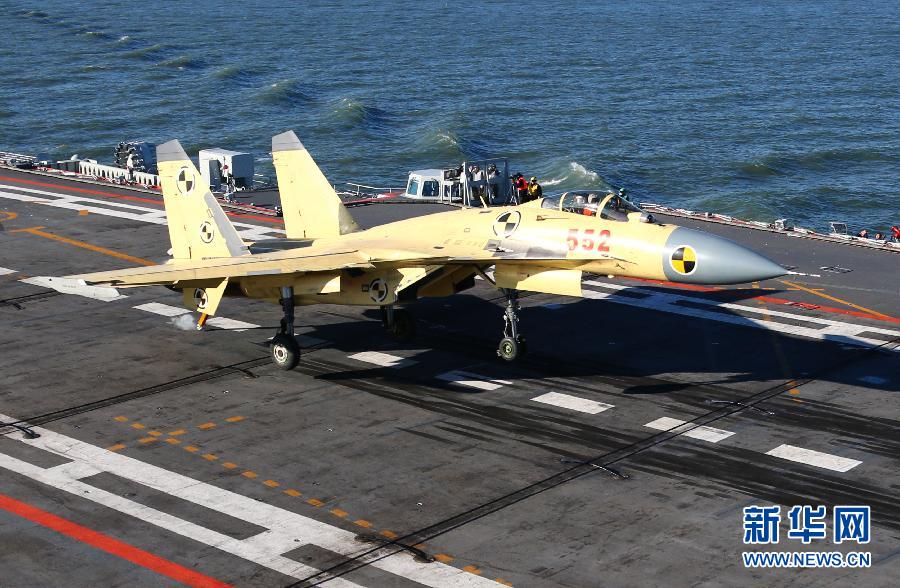圖為殲—15艦載機在“遼寧艦”上順利着艦。 9月25日我國第一艘航空母艦“遼寧艦”交接入列後,海軍官兵以科學求實的態度和頑強拼搏的精神,按計劃迅速投入緊張的出海訓練和科研試驗任務中。期間,順利進行了殲—15飛機起降飛行訓練。航母平台和飛機的技術性能得到了充分驗證,艦機適配性能良好,達到了設計指標要求。殲—15飛機是我國自行設計研製的首型艦載多用途戰鬥機,具有完全的自主知識產權,可遂行制空、制海等作戰任務,飛行性能良好,配掛多型精確制導武器,具備遠程打擊和晝夜間作戰能力。新華社記者 查春明 攝