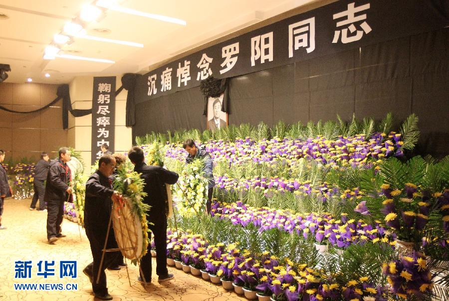 11月26日,在中航工業瀋陽飛機工業(集團)有限公司,工作人員在佈置羅陽同志追悼會的會場。我國航母艦載機殲-15研製現場總指揮、中航工業瀋陽飛機工業(集團)有限公司董事長、總經理羅陽在大連執行任務時突發心肌梗死、心源性猝死,經搶救無效於11月25日殉職,享年51歲。羅陽的追悼會將於11月29日上午在瀋陽舉行。新華社發