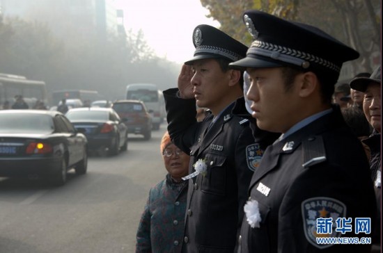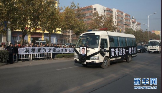 當日,在山東辦案遇襲殉職的江蘇徐州民警黃升的追悼會在徐州市舉行,社會各界羣眾趕來為英雄送行。 11月22日,年僅24歲的徐州公安局子房派出所民警黃升在山東鄒平辦案途中遭遇多名歹徒持械襲擊,為掩護戰友,黃升背部被刺中兩刀,因失血過多,搶救無效犧牲。日前,涉案犯罪嫌疑人已悉數落網。新華社發(劉峯 攝)