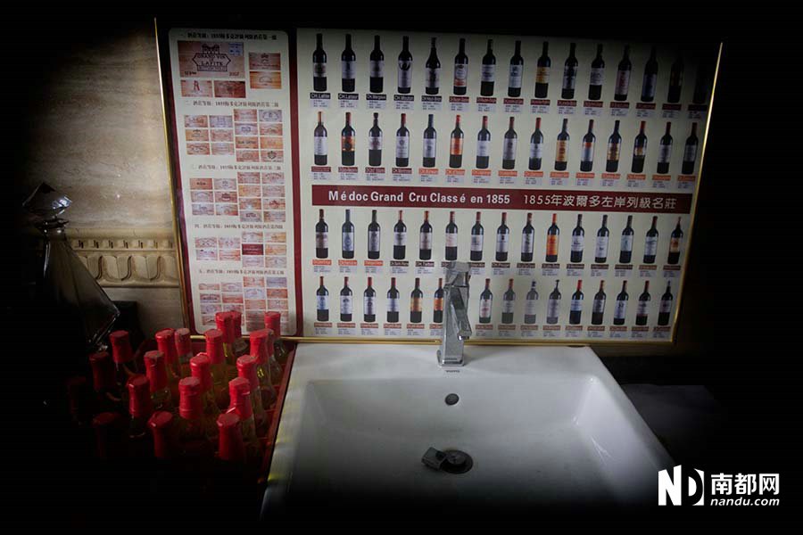 “龍哥”別墅揭秘:另外一棟別墅按照賓館風格裝修。其中一房間的洗手間貼着世界名酒的講解圖。