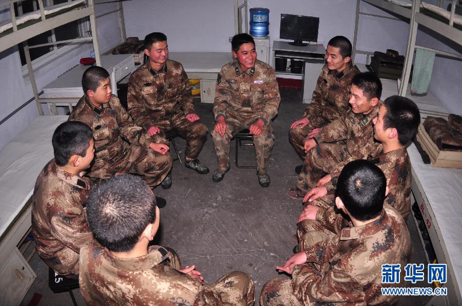 12月12日,新兵班長(中)跟新兵談心聊天。當日,濟南軍區“鐵拳團”首批新兵步入軍營,度過軍旅生活的第一個夜晚。為了給新兵營造良好的生活、學習和訓練環境,該團針對今年招收的新兵籍貫、學歷等特點,早謀劃、早部署、早安排,各項保障工作已到位。新兵一入營,就感受到了家一般的温暖。新華社發(李鵬 攝)