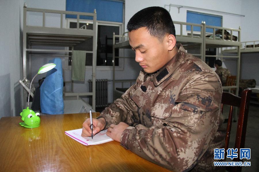 12月12日,剛入軍營的四川籍新戰士雷平準備給親人寫信報平安。當日,濟南軍區“鐵拳團”首批新兵步入軍營,度過軍旅生活的第一個夜晚。為了給新兵營造良好的生活、學習和訓練環境,該團針對今年招收的新兵籍貫、學歷等特點,早謀劃、早部署、早安排,各項保障工作已到位。新兵一入營,就感受到了家一般的温暖。新華社發(李鵬 攝)