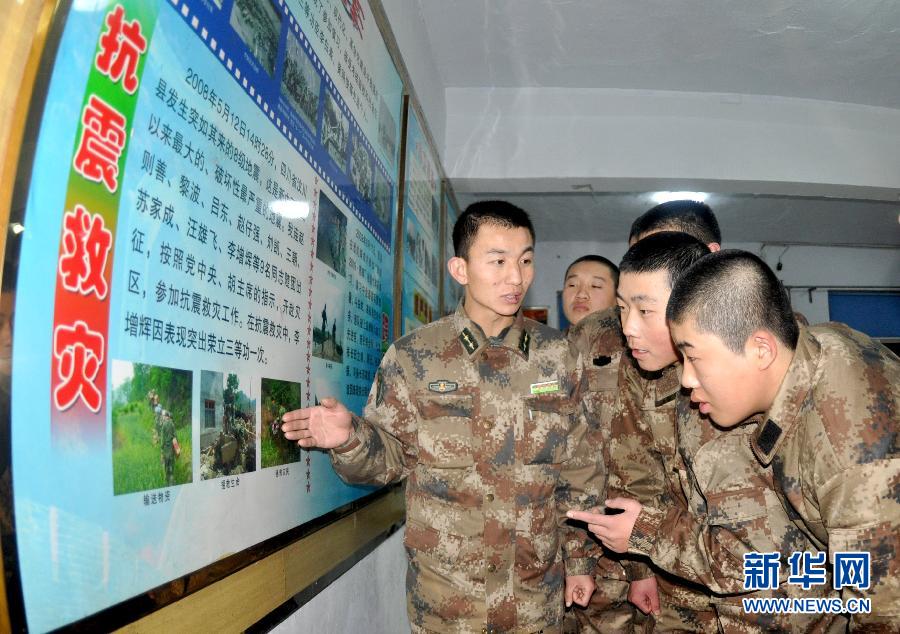 12月12日,剛剛報到的新兵參觀連史館,聽新兵排長(左一)講述連隊的歷史。當日,濟南軍區“鐵拳團”首批新兵步入軍營,度過軍旅生活的第一個夜晚。為了給新兵營造良好的生活、學習和訓練環境,該團針對今年招收的新兵籍貫、學歷等特點,早謀劃、早部署、早安排,各項保障工作已到位。新兵一入營,就感受到了家一般的温暖。新華社發(李鵬 攝)
