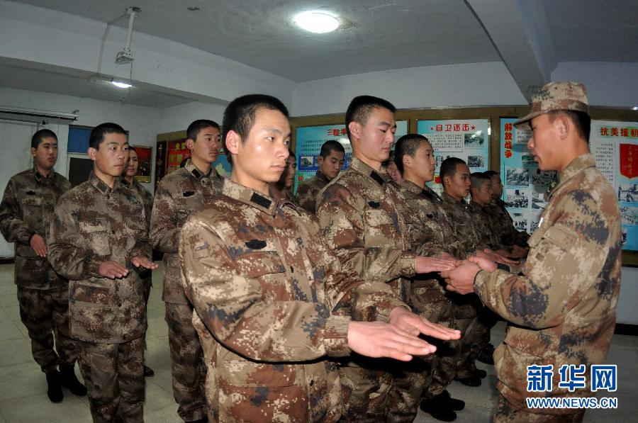12月12日,新訓班長對新入伍戰士進行軍容風紀檢查。當日,濟南軍區“鐵拳團”首批新兵步入軍營,度過軍旅生活的第一個夜晚。為了給新兵營造良好的生活、學習和訓練環境,該團針對今年招收的新兵籍貫、學歷等特點,早謀劃、早部署、早安排,各項保障工作已到位。新兵一入營,就感受到了家一般的温暖。新華社發(李鵬 攝)