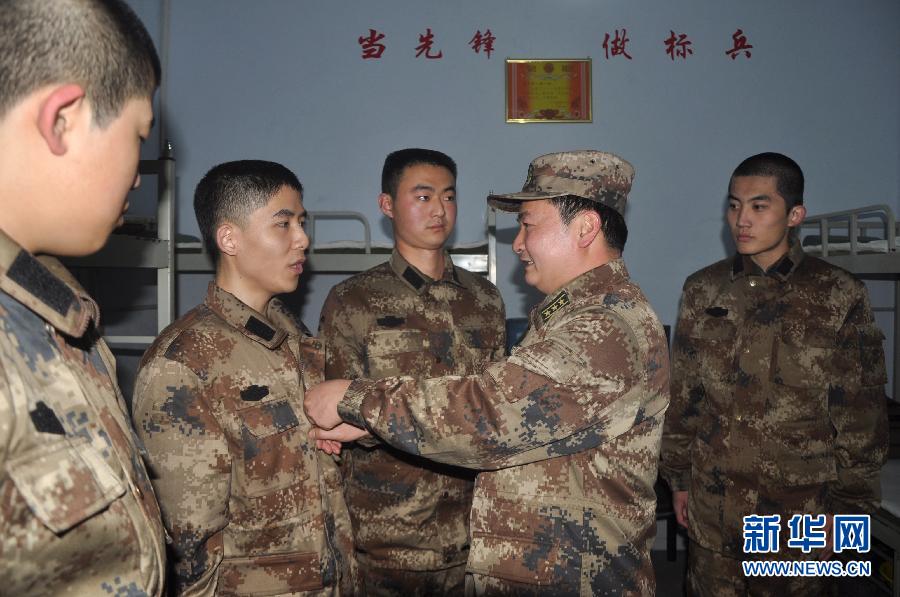 12月12日,團政委趙玉先(右二)到班排看望新戰士。當日,濟南軍區“鐵拳團”首批新兵步入軍營,度過軍旅生活的第一個夜晚。為了給新兵營造良好的生活、學習和訓練環境,該團針對今年招收的新兵籍貫、學歷等特點,早謀劃、早部署、早安排,各項保障工作已到位。新兵一入營,就感受到了家一般的温暖。新華社發(李鵬 攝)