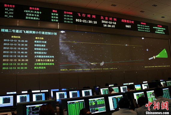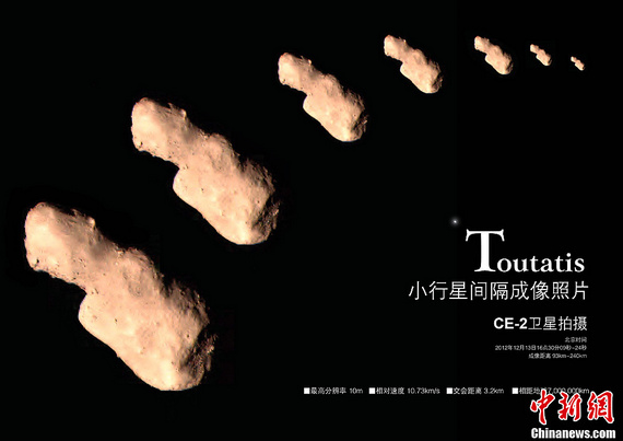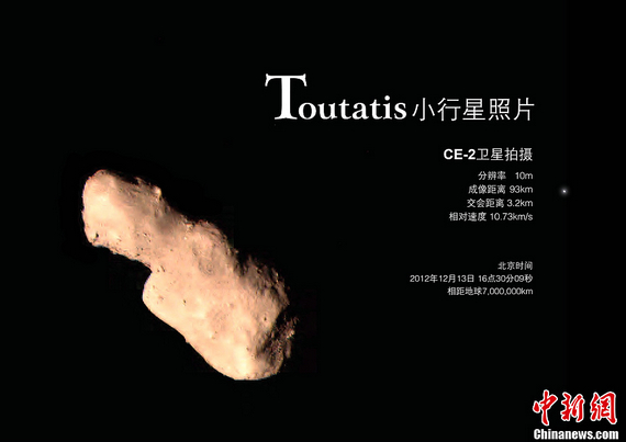 12月15日,中國國家國防科技工業局發佈消息,“嫦娥二號”衞星12月13日飛離日地拉格朗日L2點195天后,成功飛抵距地球約700萬公里遠的 深空,以10.73公里/秒的相對速度,與國際編號4179的圖塔蒂斯小行星由遠及近擦身而過,首次實現中國對小行星的飛越探測。交會時“嫦娥二號”星載 監視相機對小行星進行了光學成像,這是國際上首次實現對該小行星近距離探測。至此,“嫦娥二號”再拓展試驗圓滿成功,“嫦娥二號”工程完美收官。孫自法 攝