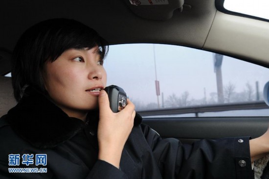 12月17日,常鴻玲用車載對講機部署巡邏工作。 “前方有霧,請開啓霧燈,速度慢點。”“哈爾濱方向下雪了,請您繞路走”……工作15年來,吉林高速公路交警常鴻玲日復一日地叮囑着來往司機。