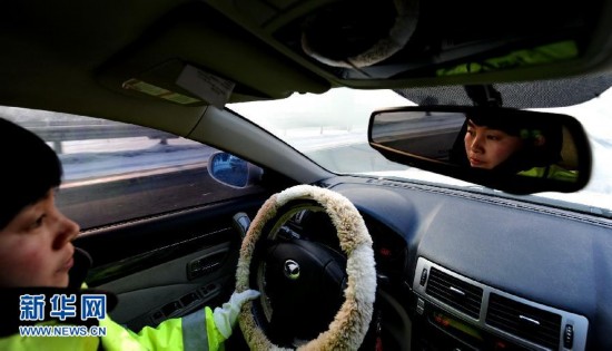 12月17日,常鴻玲在開車巡邏。 “前方有霧,請開啓霧燈,速度慢點。”“哈爾濱方向下雪了,請您繞路走”……工作15年來,吉林高速公路交警常鴻玲日復一日地叮囑着來往司機。