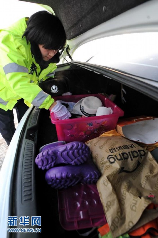 常鴻玲駕駛的警車後備箱內,裝滿了各種用品(12月17日攝)。 “前方有霧,請開啓霧燈,速度慢點。”“哈爾濱方向下雪了,請您繞路走”……工作15年來,吉林高速公路交警常鴻玲日復一日地叮囑着來往司機。