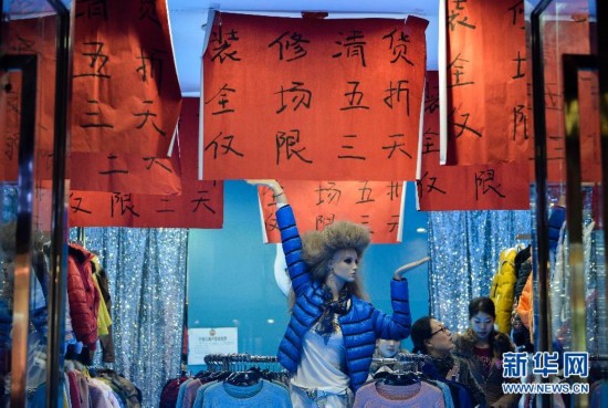 11月23日,在江蘇蘇州觀前街,一處商店內掛滿了打折促銷的廣告,等待顧客上門。新華社記者白禹攝