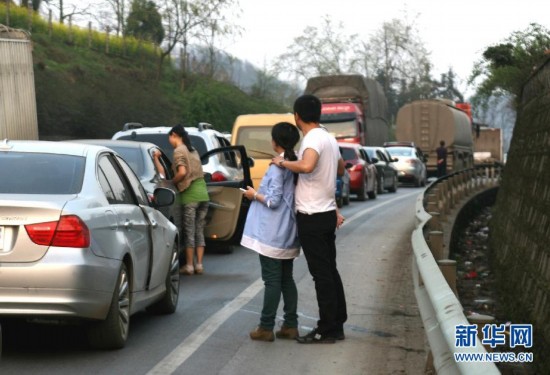 4月2日,在貴州省貴(陽)畢(節)公路六廣河至小箐路段,一名孕婦和家人下車觀望堵車長龍。當日是清明假期第一天,貴州省貴(陽)畢(節)公路六廣河至小箐路段從中午堵至天黑,車輛綿延10餘公里。新華社記者杜涓涓攝
