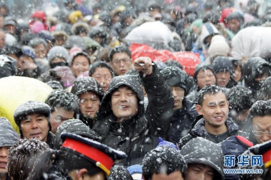 2月8日,在山東威海火車站出站口,旅客冒雪等待檢票出站。當日,一場春雪降臨山東威海。 新華社發