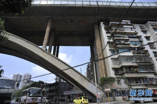貴陽市水口寺大橋300多米長的引橋下面,排列着10多棟居民建築樓,從橋頭一直蜿蜒到橋尾。房屋的樓頂與橋板之間的距離最短處不足一米,乍一看,還以為這些居民樓就是支撐大橋的橋墩。此處橋面是貴陽市的東出口和龍洞堡機場通道,車流量大,重車多,上百户在這裏居住的市民,頭頂着大橋過着“蝸居”生活。每到重車經過時,房屋也會和大橋一起抖動。不僅如此,居住在這裏的人們也早已習慣了房屋內的小裂痕和天花板上的漏水。上世紀90年代,因修建機場高速公路,建設單位貴州省高速公路開發總公司徵用了蟠桃宮部分土地,用於修建水口寺大橋。作為補償,橋下的空地則用於修建居民樓,以解決拆遷安置房和困難户的廉租房。1997年5月,大橋竣工,1999年,居民樓修建完畢,居民逐漸遷入。由於無法完善相關手續,這些房屋至今也沒有房產手續,成為城市裏的“歷史遺留問題”(8月15日攝)。新華社記者歐東衢攝