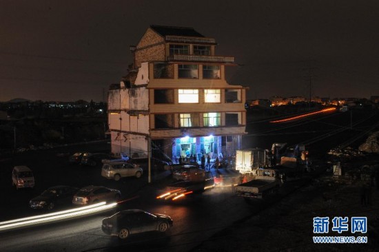 11月30日,浙江温嶺“最牛釘子户”羅保根家燈火通明準備搬家。浙江温嶺“最牛釘子户”房屋於12月1日8時40分被依法拆除。11月30日下午,户主羅保根與當地政府簽訂拆遷協議,同意將這幢5層樓房拆除,政府的補償標準不變。羅保根的家位於大溪鎮下洋張村,因温嶺火車站站前設施建設,該村的459户548間房屋面臨徵地拆遷。羅保根以家庭困難、房屋剛裝修為由,對補償標準有異議。由於羅保根家處在站前大道中央,特別突兀,經媒體報道後,被稱為“最牛釘子户”,為社會廣泛關注。新華社記者韓傳號攝