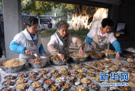 12月19日上午,新華網記者探訪温州紅日亭伏茶點。圖為義工們在準備早上喝粥的小菜。新華網記者 陶葉 攝