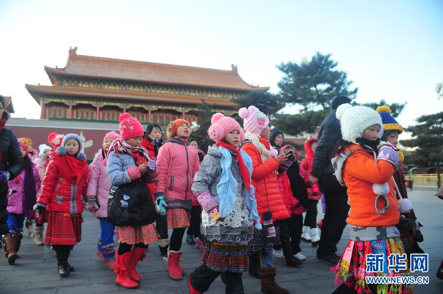 12月25日,紅軍小學的學生準備進入故宮參觀。當日,全國紅軍小學建設工程理事會組織近500名來自由井岡山、延安、山東沂蒙、江西遂川、新疆託雲等近10個革命老區和少數民族地區的紅軍小學學生,到天安門廣場觀看升旗儀式,遊覽天安門廣場。新華社發(劉長龍 攝)