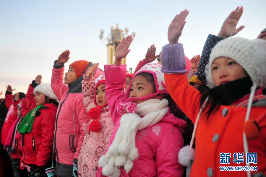 12月25日,紅軍小學學生在升旗儀式上向國旗行少先隊隊禮。當日,全國紅軍小學建設工程理事會組織近500名來自由井岡山、延安、山東沂蒙、江西遂川、新疆託雲等近10個革命老區和少數民族地區的紅軍小學學生,到天安門廣場觀看升旗儀式,遊覽天安門廣場。新華社發(劉長龍攝)