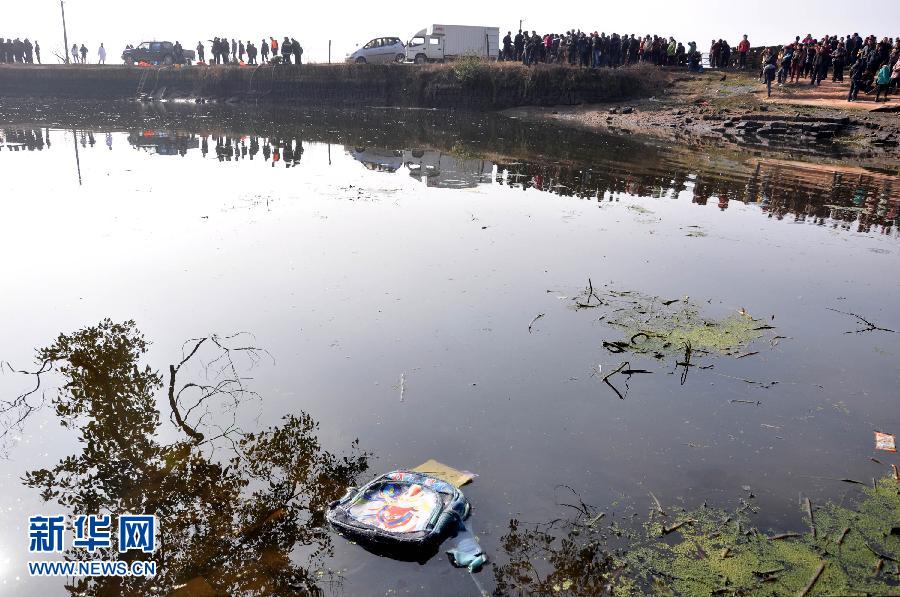 麪包車側翻墜入的水塘水面漂浮着孩子的書包(12月24日攝)。江西鷹潭市政府新聞辦稱,截至24日17時30分,貴溪市濱江鎮洪塘村麪包車墜水事故中,送醫的8名兒童搶救無效死亡。此次事故遇難兒童已升至11人,另有4名仍在醫院救治,已脱離危險。 24日9時許,貴溪市濱江鎮洪塘村一載有15名幼兒園學生的麪包車側翻墜入水塘,當場致3人死亡,12人送醫搶救。據介紹,事發水塘水深達3-4米,面積有10餘畝。事故車上除司機外還有一名老師。新華社發