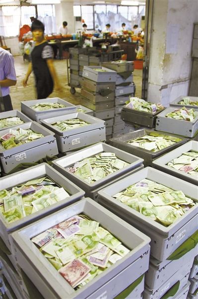 一箱零鈔倒出後,點鈔員先噴上點水,防止灰塵騰起;然後用“硬幣篩子”,將錢箱中的硬幣與紙鈔區分開。這道工序還可同時將1元、5角和角幣分開來。