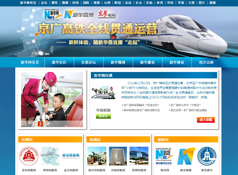 新華網12月26日訊(記者王智勇)京廣高鐵北京至鄭州段正式開通運營,標誌着京廣高鐵全線貫通。為讓廣大網友進一步瞭解我國《中長期鐵路網規劃》中“四縱四橫”高速鐵路的重要“一縱”,身臨其境感受京廣高鐵開通運營,鐵道部政治部宣傳部官方微博@中國鐵路攜手@北京鐵路、@鄭州鐵路局、@武漢鐵路局、@廣州鐵路等官方微博對京廣高鐵全線貫通進行微直播,沿線車站及服務品牌官方微博聯動播報,與網友共同搭乘“微高鐵”8小時內穿越祖國南北,分享“高鐵派的奇幻漂流”。