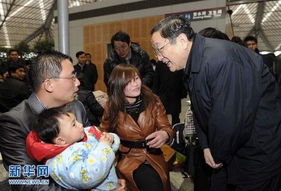 2010年2月11日,俞正聲在鐵路上海南站視察春運保障工作,並向返鄉旅客祝賀新春。 新華社發