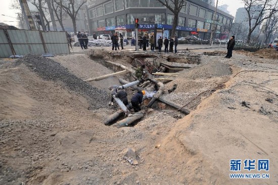 12月27日,搶險人員在太原市塌陷街道加緊搶修。當日,太原市塌陷街道開始分層回填,地下的自來水、天然氣等管線已恢復正常運行。 12月26日16時左右,太原市幷州北路與幷州東街交叉口處發生道路塌陷。路面陷坑長約15米、寬約5米、深約3至4米,造成天然氣低壓管路斷裂、中壓管路破損,自來水管道斷裂,通信線路受損。經過搶險人員連夜作業,相繼修復了天然氣、自來水等受損管線,開始對塌陷區域進行分層回填。新華社記者 詹彥 攝