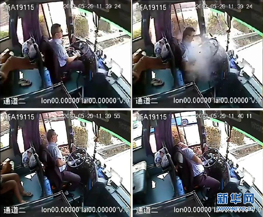 圖為5月29日事發客車上的監控錄像顯示:“最美司機”吳斌被鐵塊砸中,忍着劇痛完成一系列完整的安全停車措施後,最終癱坐在座位上(視頻截圖)。新華社發